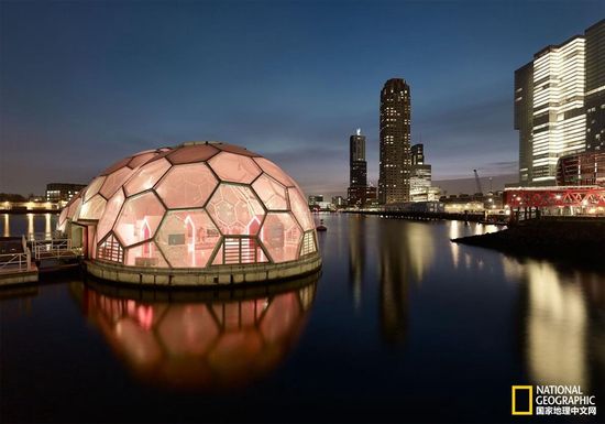 除了未來水世界里的休閑公園,鹿特丹還在積極尋求其他解決辦法。這座地勢(shì)低洼的港口城市正計(jì)劃修建水上居民區(qū),而圖中的太陽(yáng)能館則是第一步。它也是城市氣候變化應(yīng)對(duì)計(jì)劃的展覽空間。