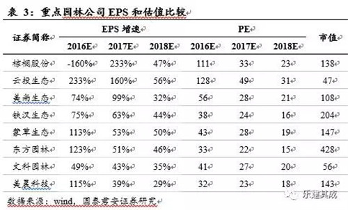 2)EPS增速和PE指標。EPS增速越高、估值越低的標的越容易被市場認可、機會越大。一般而言訂單收入比越高,業績越有保障,根據我們的統計,目前訂單收入比從高到低為東方園林、云投生態、鐵漢生態、美尚生態、棕櫚股份、美晨科技、蒙草生態、文科園林。2017年我們預測的EPS增速從高到底依次為棕櫚股份、云投生態、美尚生態、鐵漢生態、蒙草生態、東方園林、文科園林、美晨科技。2017年我們預測的PE從低到高依次為東方園林、美晨科技、鐵漢生態、蒙草生態、文科園林、美尚生態、棕櫚股份、云投生態。