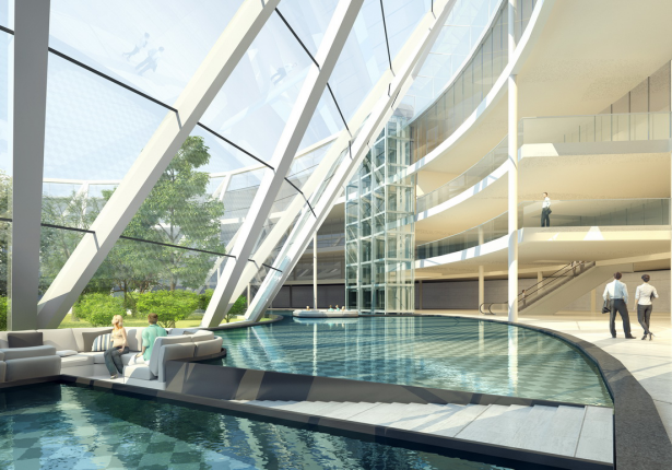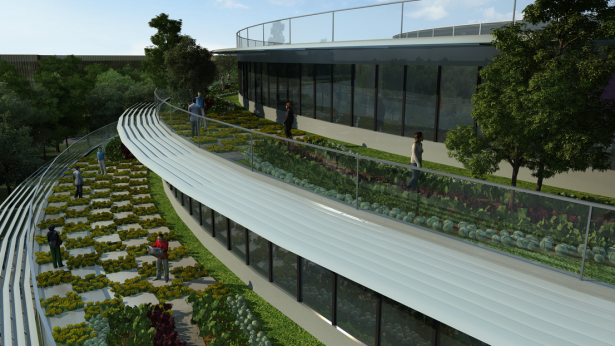 建造地點(diǎn)位于北方地區(qū),底層架空似乎是不切實(shí)際和奢望,但漫長(zhǎng)的夏季在無(wú)風(fēng)無(wú)陰涼的情況下,室外讓人難以忍受,若不接觸自然,研發(fā)人員的靈感就會(huì)枯竭、激情就會(huì)喪失、身體就會(huì)退化。經(jīng)科技人員的投票,幾乎全票通過(guò)底層架空的建筑、景觀一體化方式。建安成本增加與建筑面積的減損,最終沒(méi)能擋住人對(duì)自然的需求。