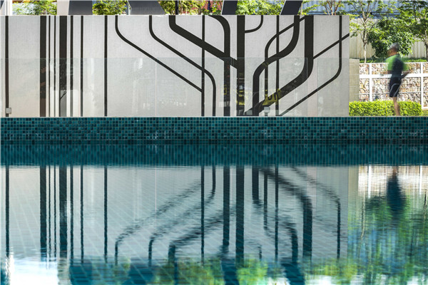 樹型樣式雕塑與的墻面重疊之下構成了一幅特色墻,將并設計倒影投影在池中。將兩者結合得天衣無縫。