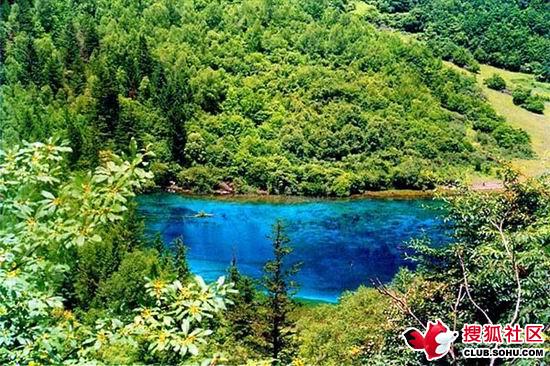從山頂往下看,只見那萬綠叢中有一點藍色